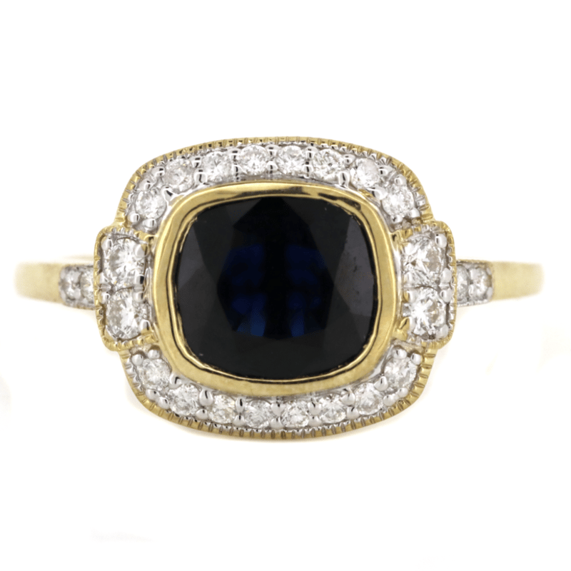 The Centre Features, One Cushion Mixed Cut, Dark Royal Blue, Sapphire (1.63Ct, Moderately Included), Bezel Set. Surrounding The Centre And Decorating The Shoulders Are, 24 Round Brilliant Cut, Diamonds (0.27Ct Tdw, G-H Colour, Si1-Si2 Clarity), Bead Set With Millegrain Detail. Ring Size O.