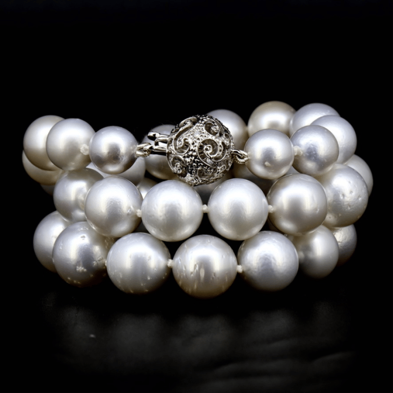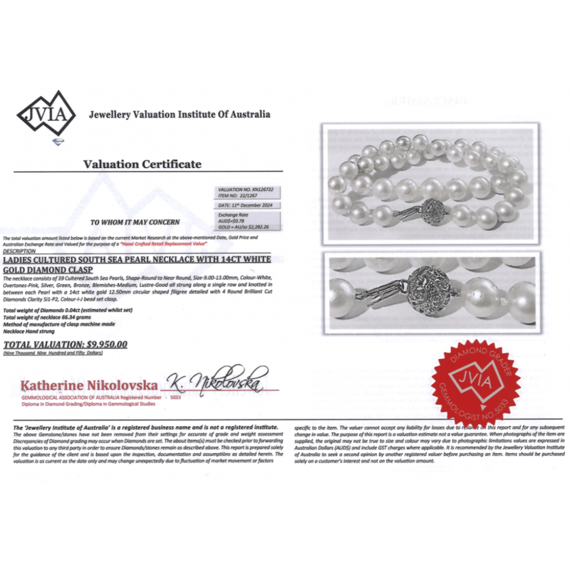The Design Features, 39 Near Round, White With Silver, Pink, Green And Bronze Overtones, Cultured South Sea Pearls (9.00Mm - 13.00Mm Size, Lustre, Slightly Blemished). Embellishing The 14K White Gold, Filigree Ball Clasp Are, 4 Round Brilliant Cut, Diamonds (0.04Ct Tdw, I-J Colour, Si1-P2 Clarity), Bead Set. Necklace Length Is 44Cm.