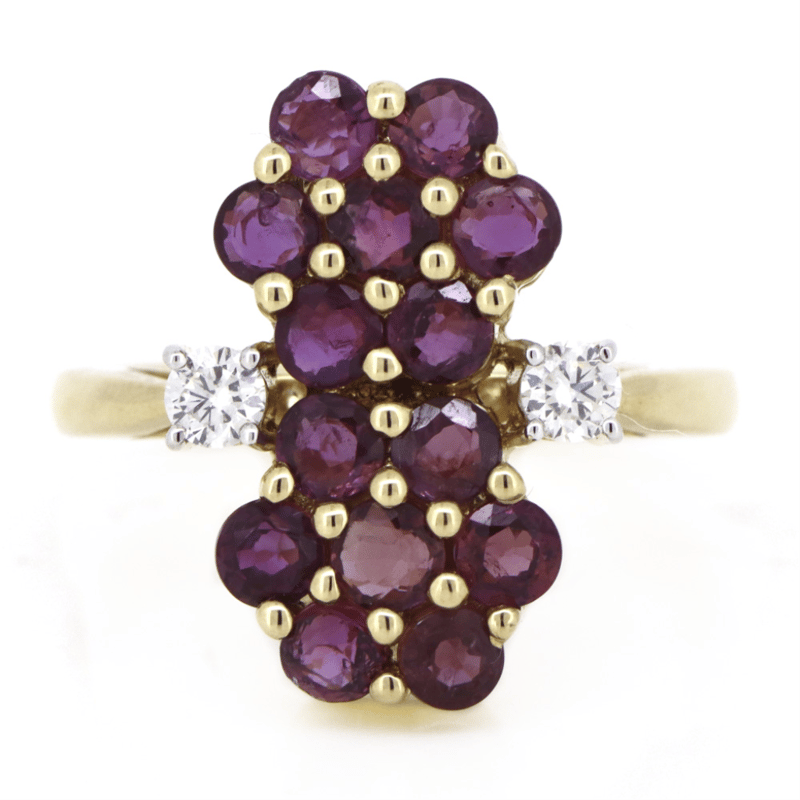 14K YELLOW GOLD, PINK SAPPHIRE AND DIAMOND, FLORAL RING. The Design Features, 14 Round Cut, Dark Purplish-Pink, Sapphires (2.16Ct Tsw, Light Moderate Inclusions), Bead Set In Two Flower Designs. Accompanied By, 2 Round Brilliant Cut, Diamonds (0.17Ct Tdw, G-H Colour, Si Clarity), 4 Claw Set. Ring Size K. Valuations Provided by an Independent Third-Party Professional Not Directly Associated With Lloyds Auctions at AUD $$11,400.00This valuation has been conducted by an independent third-party professional. The valuation amount is an assessment by the issuing valuer and does not reflect the auction value of the item. Any inquiries regarding the valuation should be directed to the issuing valuer (refer to contact details on the certificate), as Lloyds Auctions has no affiliation or influence over the valuation, the valuer, or the stated amount. Condition: Good - Refer Images 0645923+1520