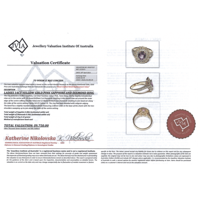 The Centre Features, One Oval Faceted Cut, Deep Pink, Sapphire (0.88Ct, Slightly Included), 4 Claw Set. Surrounding The Centre In A Double Halo And Decorating The Band Are, 50 Round Brilliant Cut, Diamonds (0.56Ct Tdw, I-K Colour, Si2-P2 Clarity), Bezel/Claw/Bead Set. The Ring Has Been Detailed With Millegrain Edging. Ring Size M 1/2.