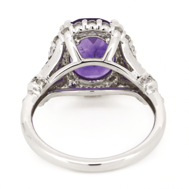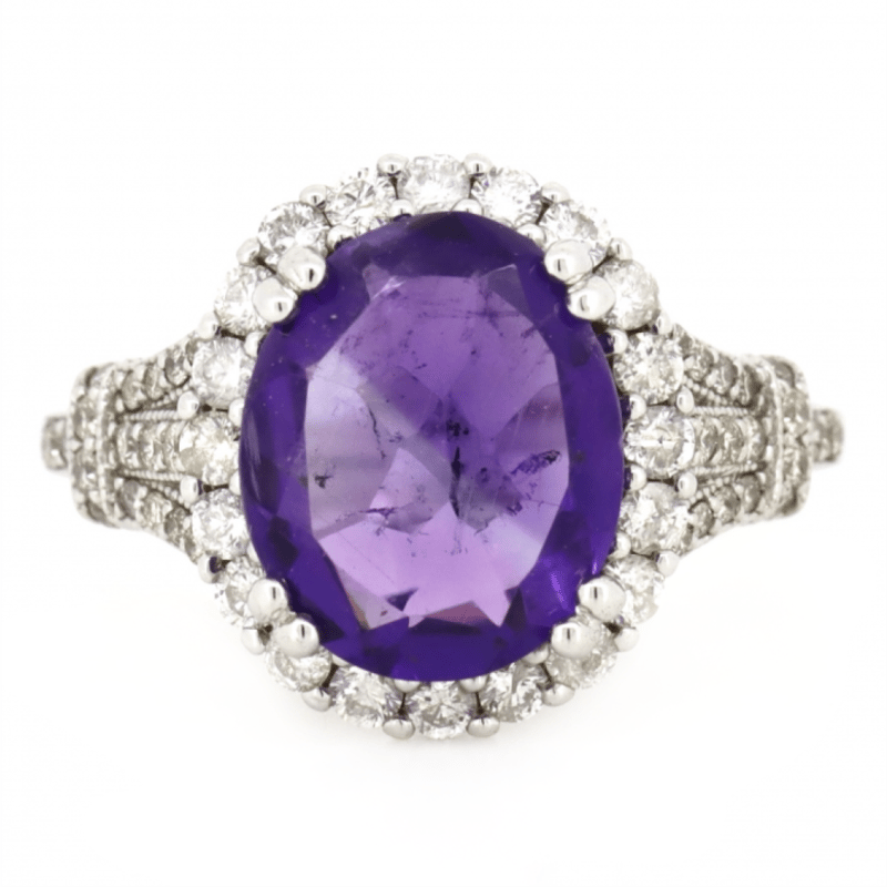 The Centre Features, One Oval Cut, Medium Purple, Amethyst (3.21Ct, Eye Clean Clarity), Claw Set. Surrounding The Centre In A Halo And Decorating The Setting Are, 64 Round Brilliant Cut, Diamonds (0.80Ct Tdw, J-K Colour, Si2-I2 Clarity), Bead/Claw Set. Ring Size O.