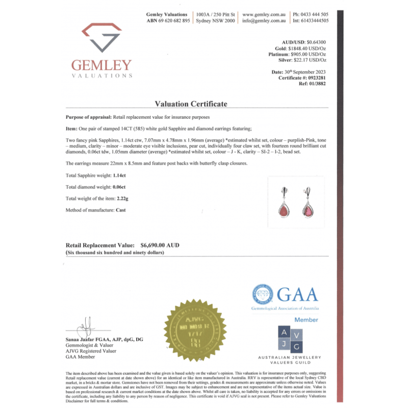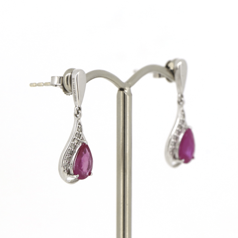 The Design Features, 2 Pear Cut, Medium Purplish-Pink, Sapphires (1.14Ct Tsw, Minor - Moderate Eye Visible Inclusions), Claw Set. Decorating The Design Are, 14 Round Brilliant Cut, Diamonds (0.06Ct Tdw, J-K Colour, Si2-I2 Clarity), Bead Set. The Earrings Have Post Backs, With 14K White Gold Butterfly Clasps.