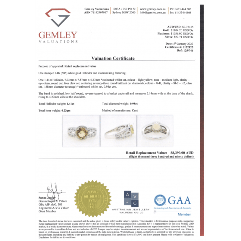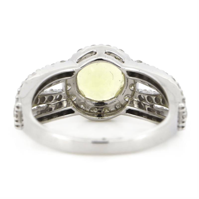 The Centre Features, One Round Cut, Medium Light Yellow, Heliodor (1.41Ct, Eye Clean Clarity), 4 Claw Set. Surrounding The Centre In A Halo And Decorating The Band Are, 73 Round Brilliant Cut, Diamonds (0.98Ct Tdw, G-H Colour, Si2-I2 Clarity), Claw Set. Ring Size N 1/2.