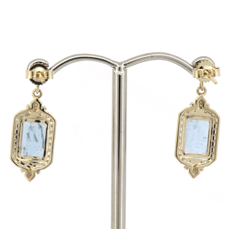 14K YELLOW GOLD, AQUAMARINE AND DIAMOND, DROP EARRINGS. The Centres Feature, 2 Emerald Cut, Medium Blue, Aquamarines (2.99Ct Tsw, Moderately Included), 4 Claw Set. Accompanying The Design Are, 54 Round Brilliant And 8 Baguette Cut, Diamonds (0.36Ct Tdw, H-J Colour, Si-I2 Clarity), Bead Set. The Earrings Have Post Backs With 14K Yellow Gold Butterfly Clasps. Valuations Provided by an Independent Third-Party Professional Not Directly Associated With Lloyds Auctions at AUD $$15,300.00This valuation has been conducted by an independent third-party professional. The valuation amount is an assessment by the issuing valuer and does not reflect the auction value of the item. Any inquiries regarding the valuation should be directed to the issuing valuer (refer to contact details on the certificate), as Lloyds Auctions has no affiliation or influence over the valuation, the valuer, or the stated amount. Condition: Good - Refer Images 0645923+1549