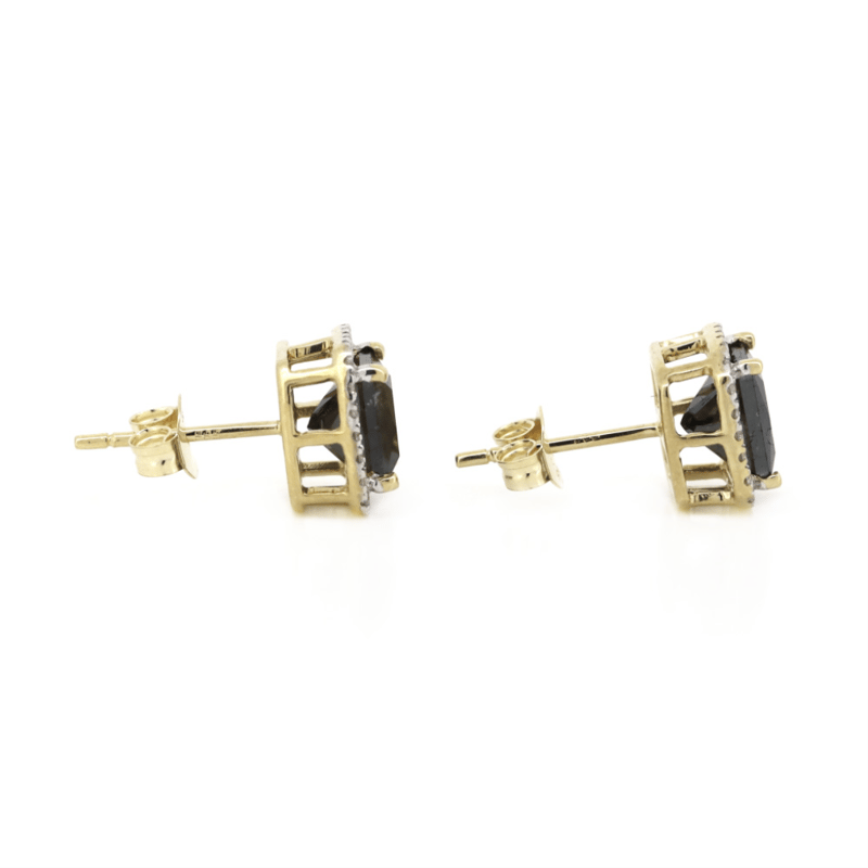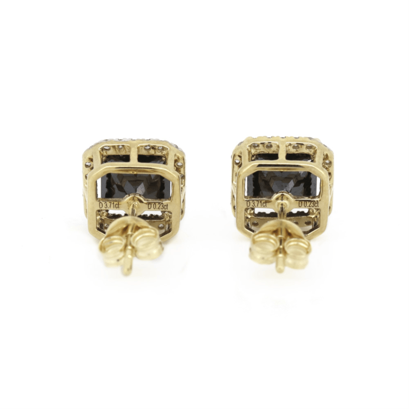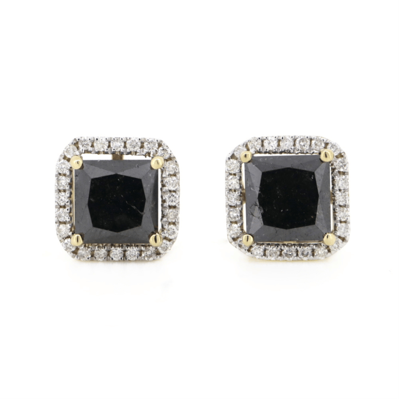 14K YELLOW GOLD, BLACK DIAMOND, HALO STUD EARRINGS. The Centres Feature, 2 Princess Cut, Black Diamond (3.71Ct Tsw, Opaque Clarity), 4 Claw Set In Yellow Gold. Surrounding The Centres In Halos Are 48 Round Brilliant Cut Diamonds (0.23Ct Tdw, G-H Colour, Si1-Si2 Clarity), Micro-Claw Set. The Earrings Have Post Backs, With 14K Yellow Gold Butterfly Clasps. Valuations Provided by an Independent Third-Party Professional Not Directly Associated With Lloyds Auctions at AUD $$10,000.00This valuation has been conducted by an independent third-party professional. The valuation amount is an assessment by the issuing valuer and does not reflect the auction value of the item. Any inquiries regarding the valuation should be directed to the issuing valuer (refer to contact details on the certificate), as Lloyds Auctions has no affiliation or influence over the valuation, the valuer, or the stated amount. Condition: Good - Refer Images 0645923+1550