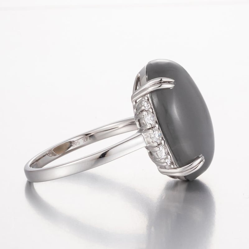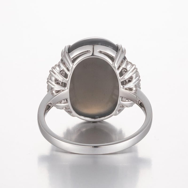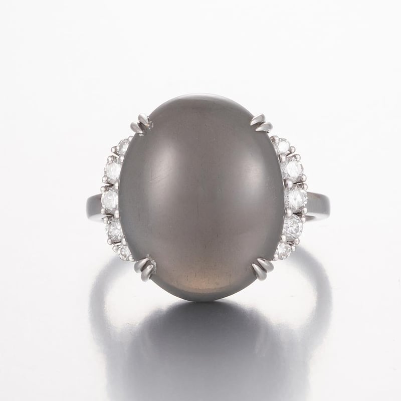 Featuring Cente, One Oval Cabochon Cut, Medium Silvery-Grey Moonstone (10.82Ct, Opaque), Double Claw Set, With 10 Round Brilliant Cut Diamonds (0.33Ct Tdw, G-H Colour, Si1-Si2 Clarity), Bead Set. Ring Size O.