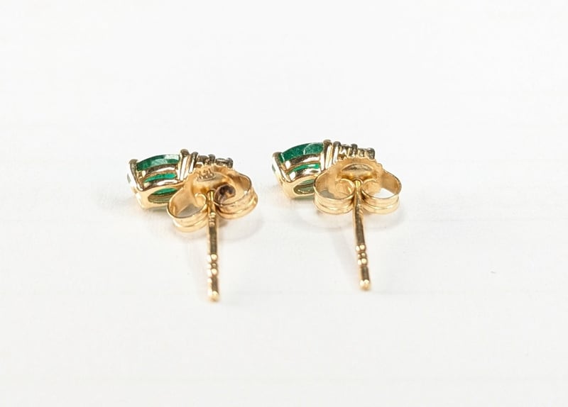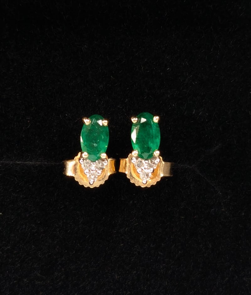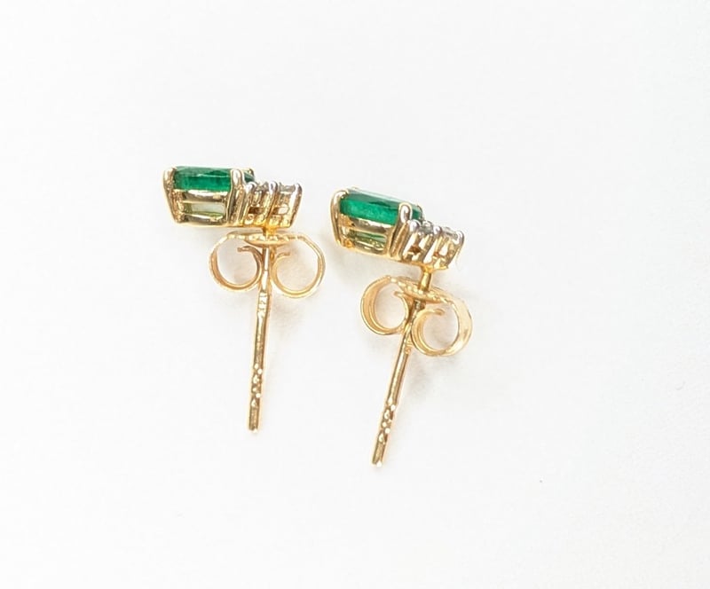 14K YELLOW GOLD EARRINGS WITH 2 OVAL CUT EMERALDS & 6 DIAMONDS.