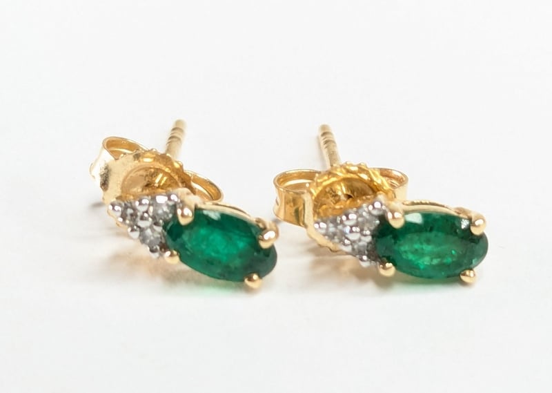 14Ct Yellow Gold Emerald And Diamond Stud Earrings Featuring, 2 Oval Cut, Medium Green Emeralds 0.52Ct, 4-Claw Set, With 6 Round Brilliant Cut Diamonds, Si1-I3 Clarity, I-K Colour, Prong Set.