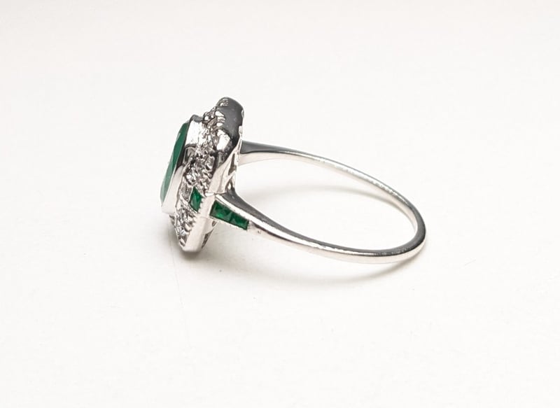 18CT WHITE GOLD RING WITH 1.32CT EMERALD, 6 CHECKER BOARD EMERALDS CT, AND 36 BRILLIANT CUT DIAMONDS.