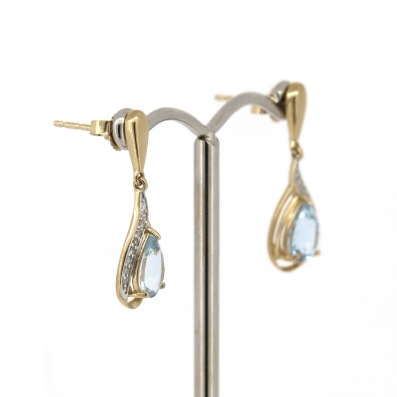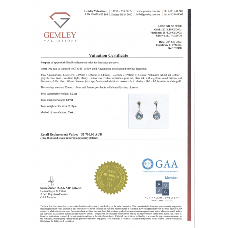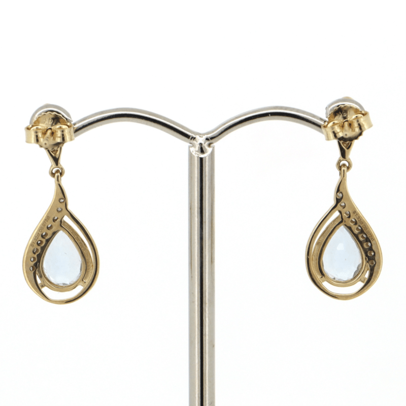 The Centres Feature, 2 Pear Cut, Greyish-Blue, Aquamarines (1.32Ct Tsw, Minor Eye Visible Inclusions), 3 Claw Set. Surrounding The Centres Are, 18 Round Brilliant Cut, Diamonds (0.07Ct Tdw, J-K Colour, Si2-I2 Clarity), Bead Set. The Earrings Have Post Backs, With 14K Yellow Gold Butterfly Clasps.