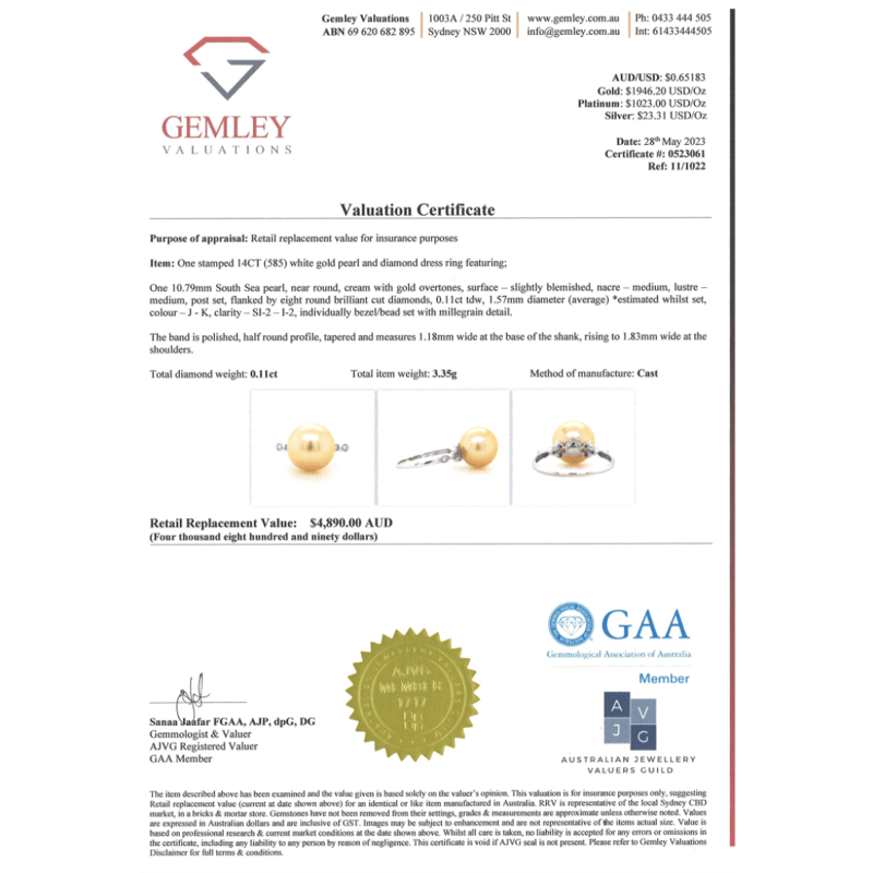 The Design Features, One Cream With Gold Overtones, Near Round, Cultured South Sea Pearl (10.79Mm Size, Medium-Lustre), Post Set. Flanked By, 8 Round Brilliant Cut, Diamonds (0.11Ct Tdw, J-K Colour, Si2-I2 Clarity), Bezel/Bead Set. Ring Size N.