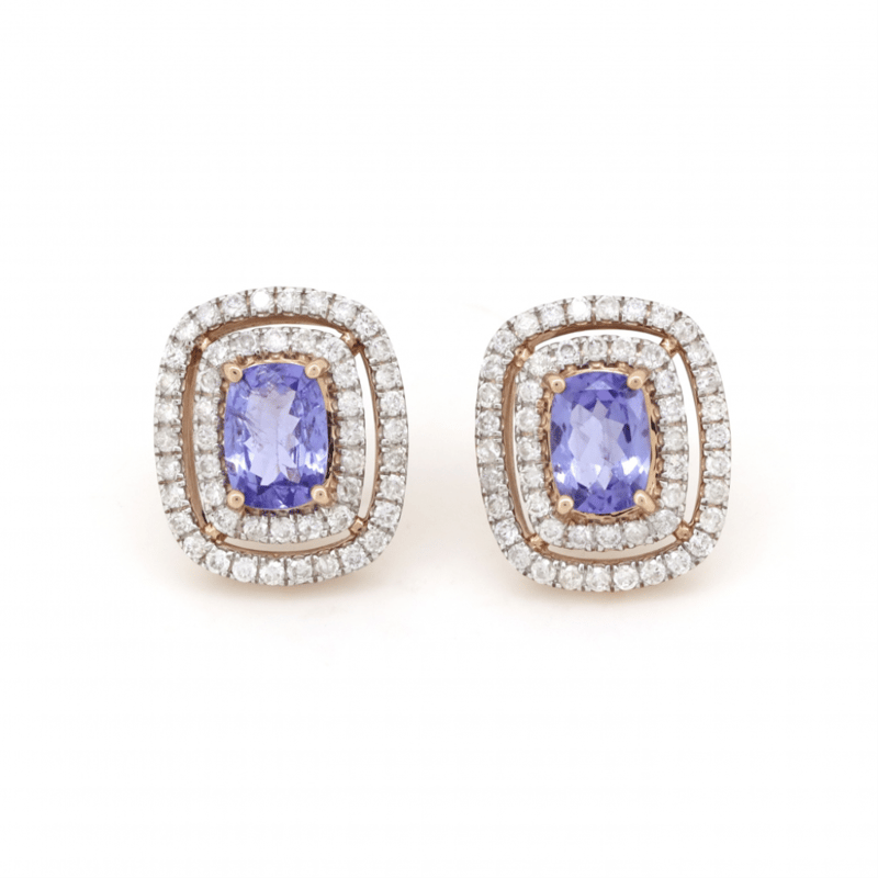 The Centres Feature, 2 Rectangular Cushion Faceted Cut, Purplish-Blue, Tanzanites (1.97Ct Tsw, Included), 4 Claw Set. Surrounding The Centres In Double Halos Are, 100 Round Brilliant Cut, Diamonds (0.83Ct Tdw, I-K Colour, P1-P2 Clarity), Claw Set. The Earrings Have Post Backs, With 14K Rose Gold Butterfly Clasps.