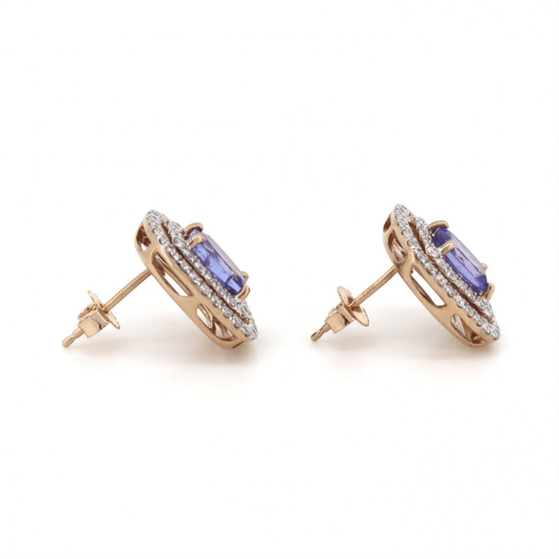 14K ROSE GOLD, TANZANITE AND DIAMOND, DOUBLE HALO STUD EARRINGS.