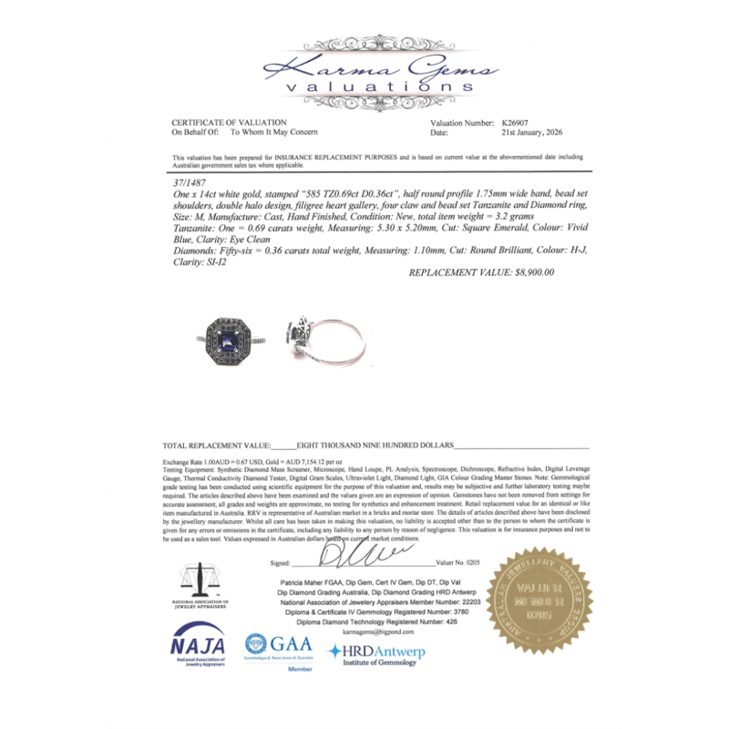 The Centre Features, One Emerald Cut, Tanzanite (0.69Ct, Eye Clean), 4 Claw Set. Surrounding The Centre In A Double Halo And Decorating The Band Are, 56 Round Brilliant Cut, Diamonds (0.36Ct Tdw, H-J Colour, S1-2 Clarity), Bead Set. Ring Size M.
