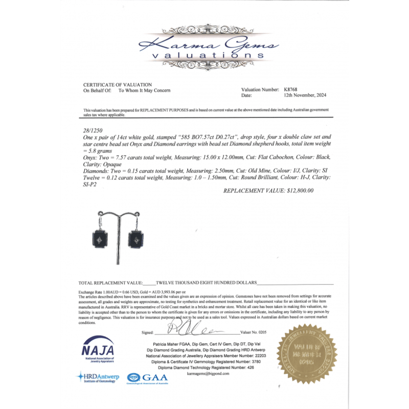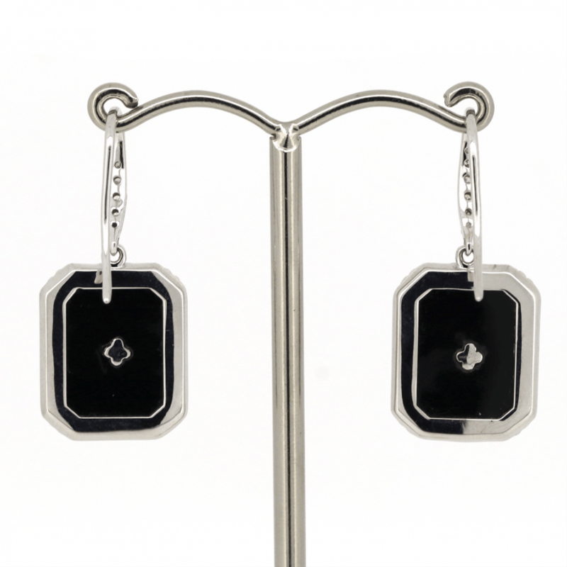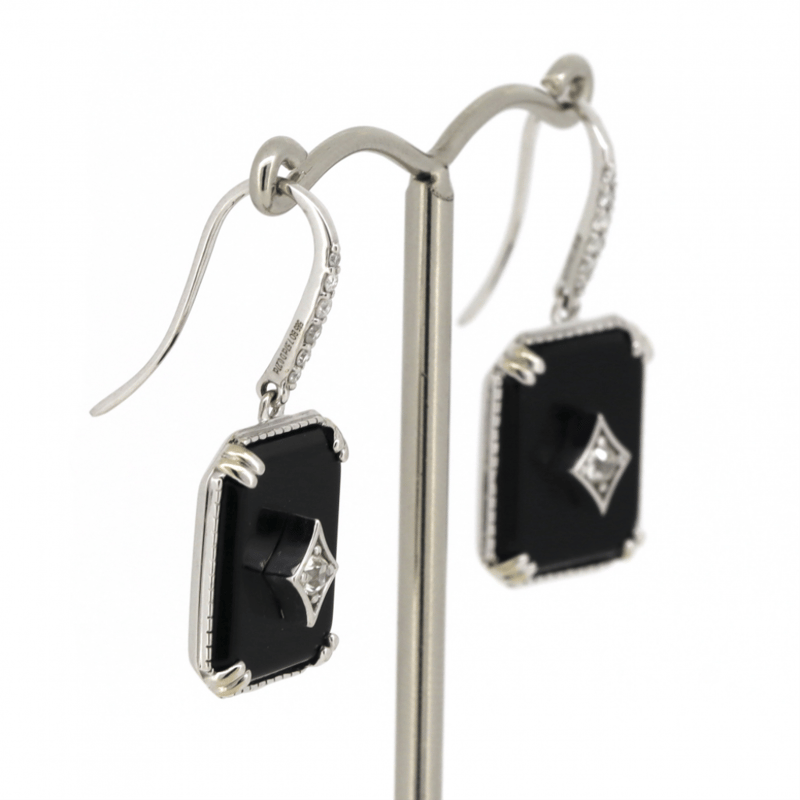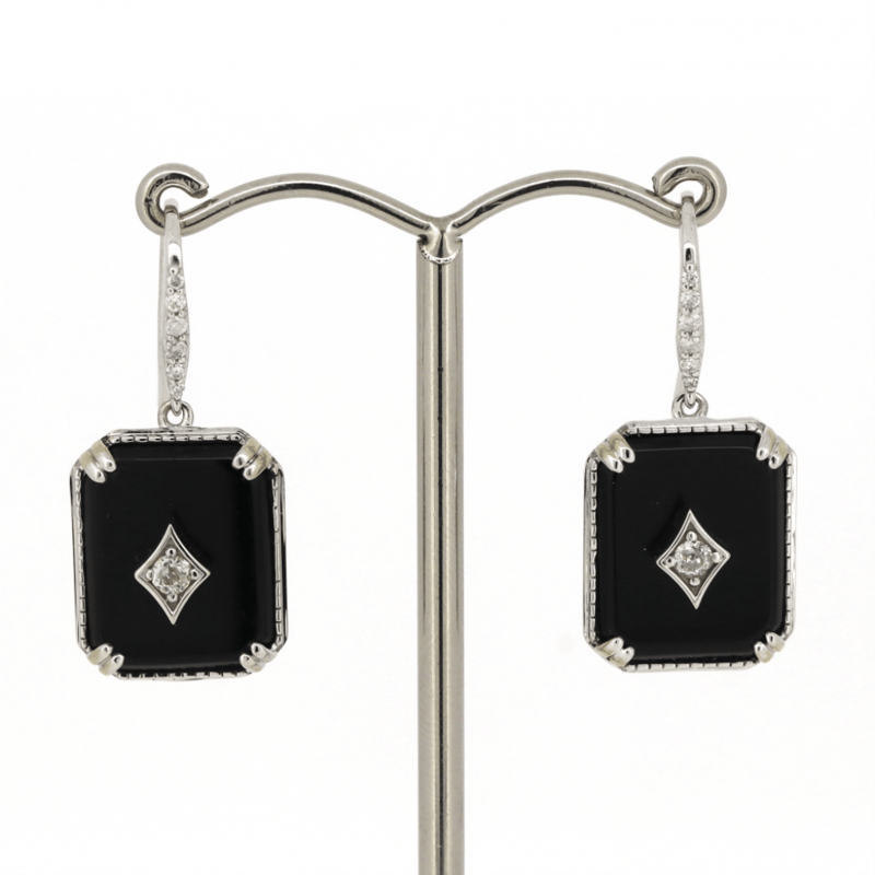 14K WHITE GOLD, ONYX AND DIAMOND, DROP EARRINGS.