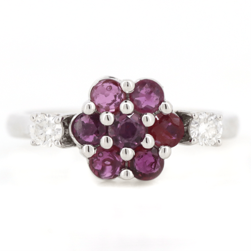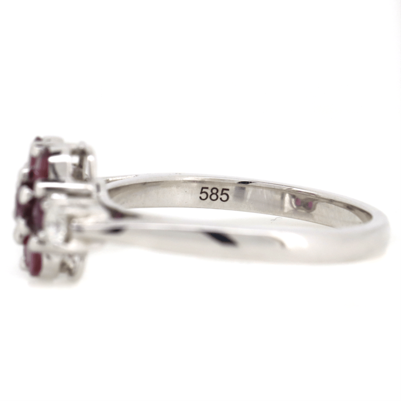 14K WHITE GOLD, RUBY AND DIAMOND, FLOWER RING.