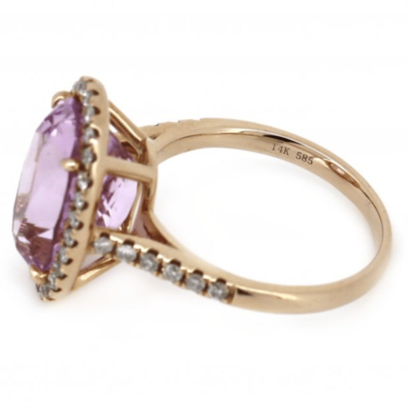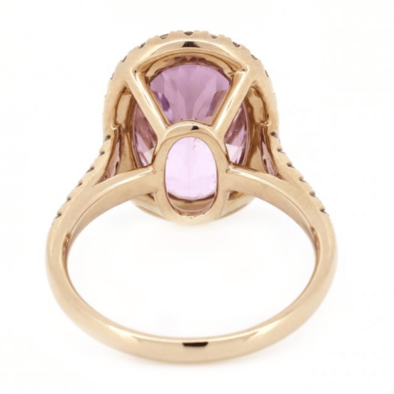 The Centre Features, One Oval Faceted Cut, Purplish-Pink, Kunzite (6.47Ct, Slightly Included), 4 Claw Set. Surrounding The Centre In A Halo And Decorating The Band Are, 40 Round Brilliant Cut, Diamonds (0.42Ct Tdw, I-K Colour, Si2-P2 Clarity), Claw Set. Ring Size M.