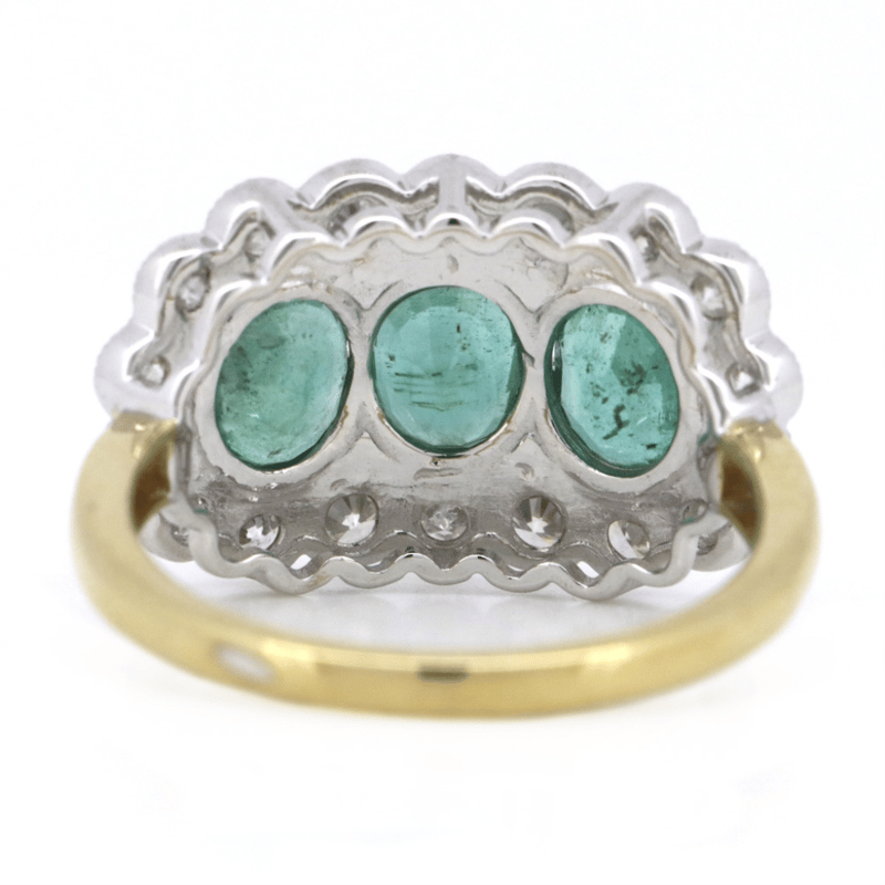 The Centre Features, 3 Oval Cut, Medium Dark Bluish-Green, Emeralds (1.94Ct Tsw, Included), Semi-Bezel Set. Encompassing The Centre Are, 18 Round Brilliant Cut, Diamonds (1.01Ct Tdw, H-K Colour, Si2-I2 Clarity), Bead Set In White Gold With Millegrain Detail. Ring Size L 1/2.