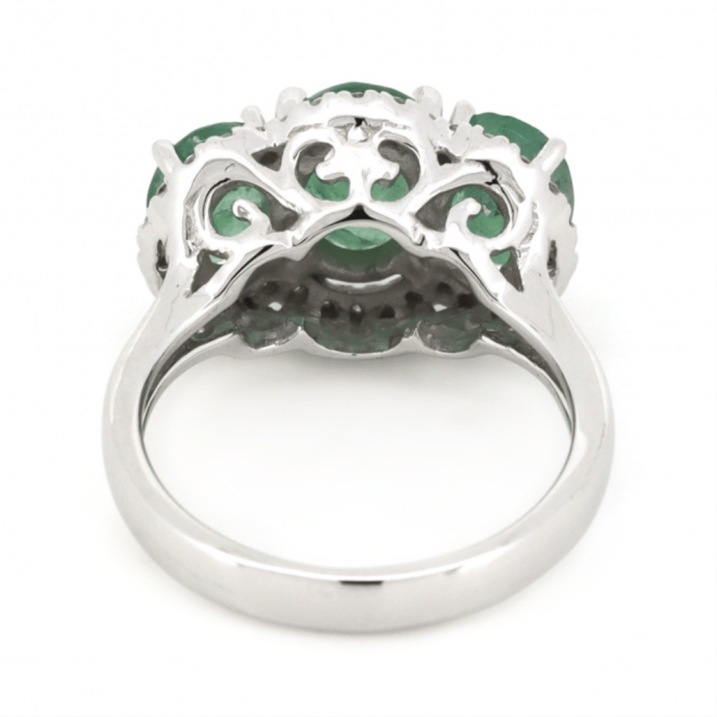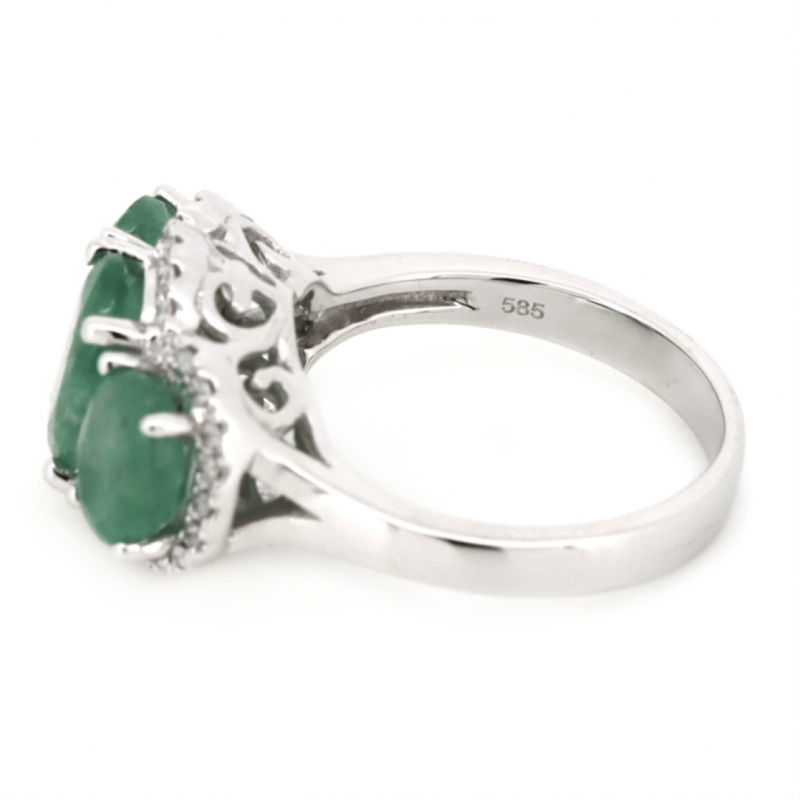 14K WHITE GOLD, EMERALD AND DIAMOND, HALO TRILOGY RING.