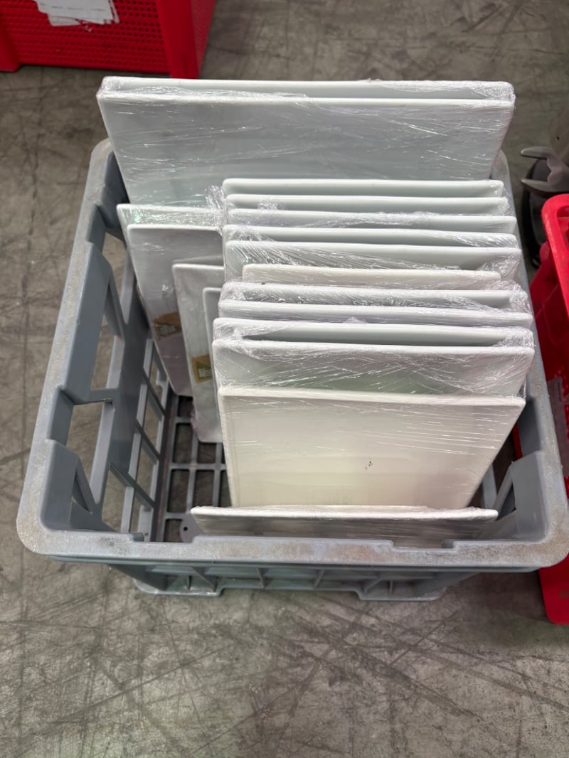 Crate of white serving platters, used condition