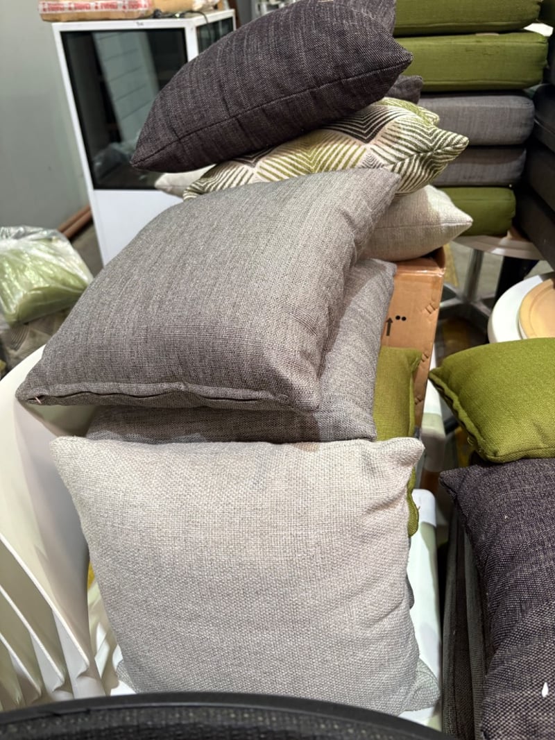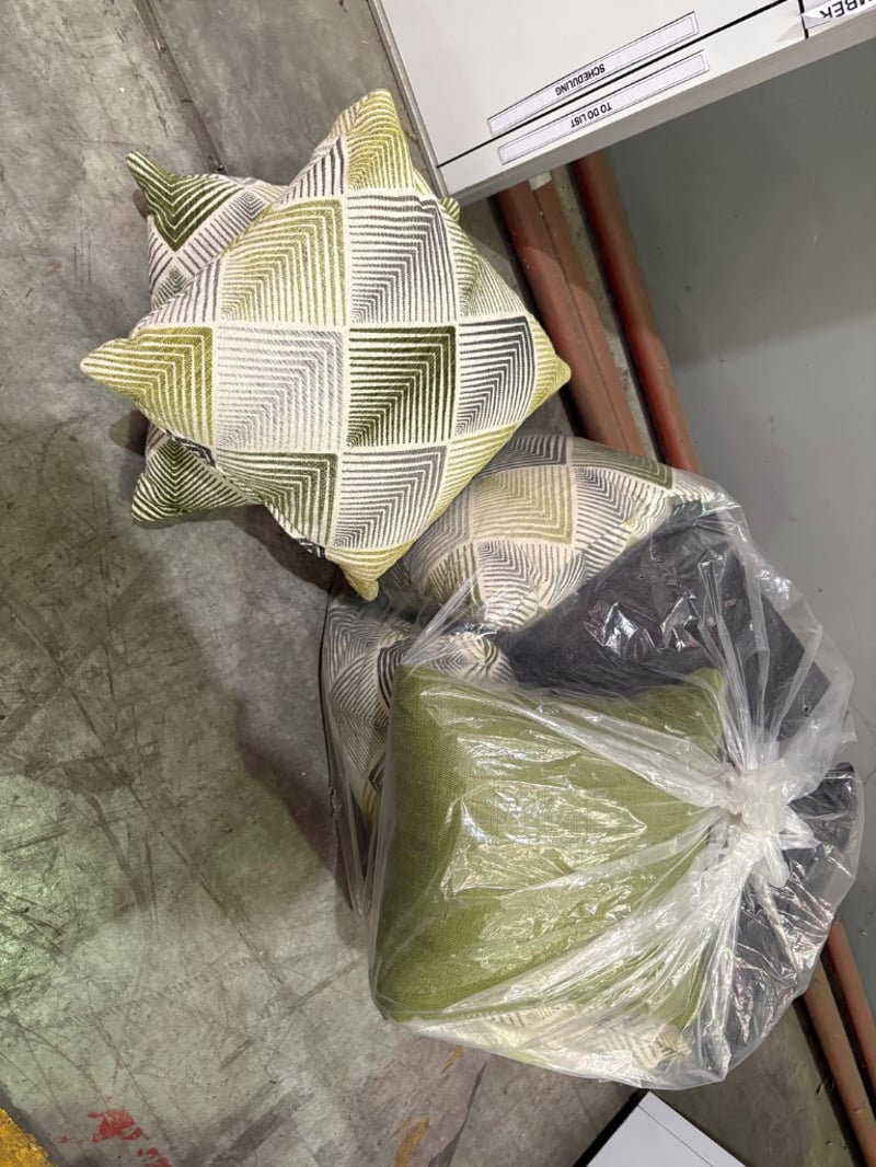 Assorted Cushions and Pillows. Fabric Style, Grey, Green and Patterned.