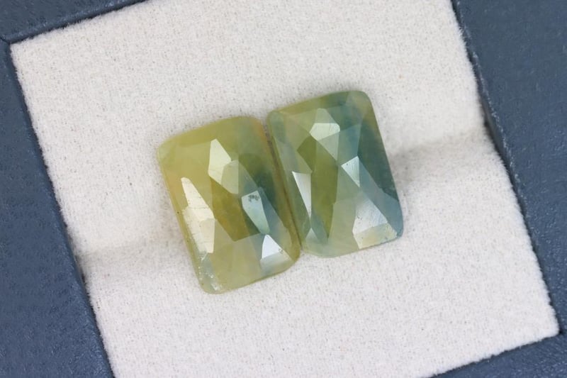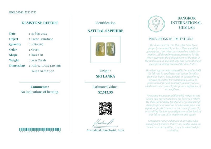 13.4 CARATS CERTIFIED NATURAL SAPPHIRE Gemstone : Natural SapphireCertificate Number : Bigl20240122131753Weight : 16.21 CaratsColor : GreenMeasurement : 15.80 X 10.52 X 3.20 MmShape : Rose CutQuantity : 2 PieceOrigin : Sri LankaComments : No Indications Of Heating.• Use The Qr Code On The Packaging To View And Download The Certificate. • Verify Report Online At Www.Bangkokinternationalgemlab.Co 0+3