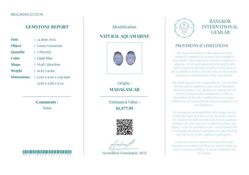 16.61 CARATS CERTIFIED NATURAL AQUAMARINE Gemstone : Natural AquamarineCertificate Number : Bigl20240122132158Weight : 16.61 CaratsColor : Light BlueMeasurement : 13.62 X 9.90 X 5.99 MmShape : Oval CabochonQuantity : 2 PieceOrigin : MadagascarComments : None• Use The Qr Code On The Packaging To View And Download The Certificate. • Verify Report Online At Www.Bangkokinternationalgemlab.Co 0+30