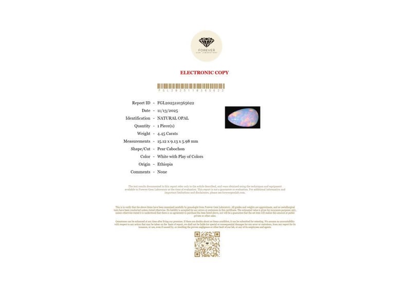 4.45 CARATS NATURAL OPAL - WHITE WITH PLAY OF COLORS 4.45 Carats Natural OpalCertificate Number - Fgl2025110365622Color - White With Play Of ColorsShape - Pear CabochonDimension - 15.12 X 9.13 X 5.98 MmOrigin - EthiopiaComments - NoneGood Quality With Luster Condition: Good - Refer Images 0488434+11