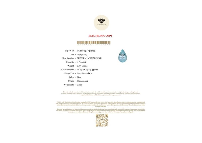 2.33 CARATS NATURAL AQUAMARINE 2.33 Carats Natural AquamarineCertificate Number - Fgl2025110365635Color - BlueShape - Pear Faceted CutDimension - 12.69 X 8.23 X 5.34 MmOrigin - MadagascarComments - NoneGood Quality With Luster Condition: Good - Refer Images 0488434+24