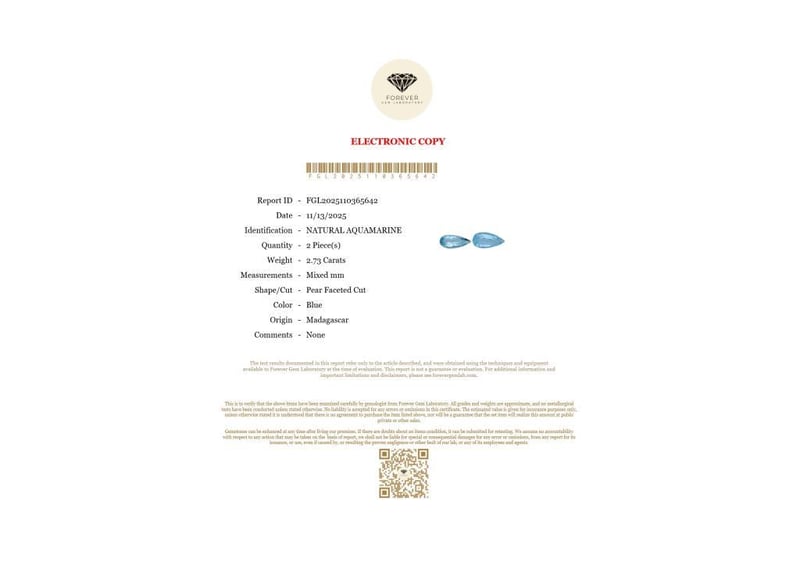 2.73 CARATS NATURAL AQUAMARINE 2.73 Carats Natural AquamarineCertificate Number - Fgl2025110365642Color - BlueShape - Pear Faceted CutDimension - Mixed MmOrigin - MadagascarComments - NoneGood Quality With Luster Condition: Good - Refer Images 0488434+31