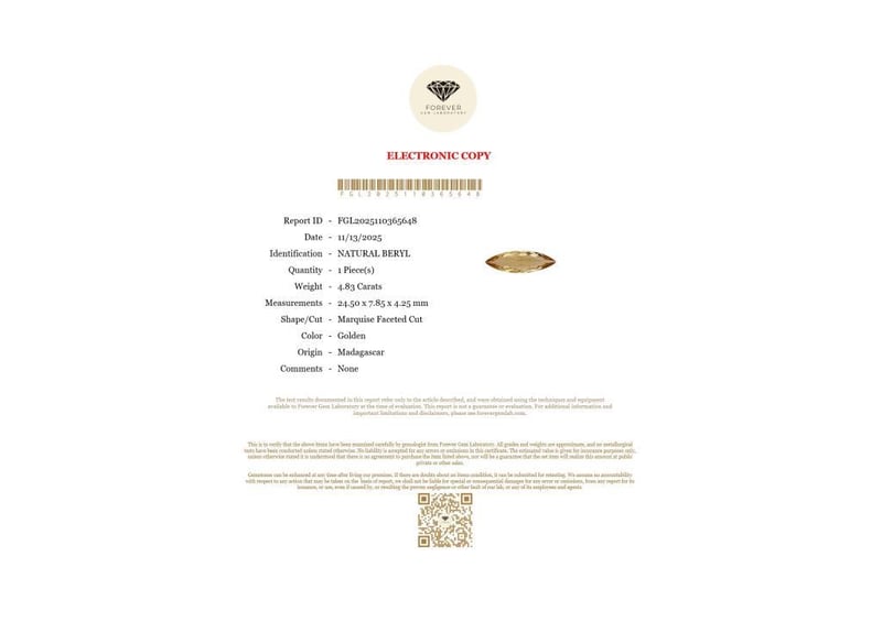 4.83 CARATS NATURAL YELLOW BERYL 4.83 Carats Natural BerylCertificate Number - Fgl2025110365648Color - GoldenShape - Marquise Faceted CutDimension - 24.50 X 7.85 X 4.25 MmOrigin - MadagascarComments - NoneGood Quality With Luster Condition: Good - Refer Images 0488434+37