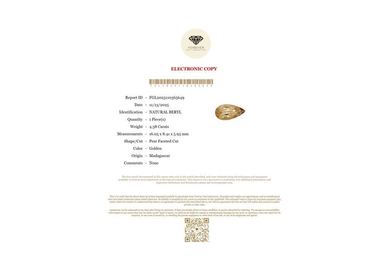 4.38 CARATS NATURAL YELLOW BERYL 4.38 Carats Natural BerylCertificate Number - Fgl2025110365649Color - GoldenShape - Pear Faceted CutDimension - 16.05 X 8.41 X 5.95 MmOrigin - MadagascarComments - NoneGood Quality With Luster Condition: Good - Refer Images 0488434+38