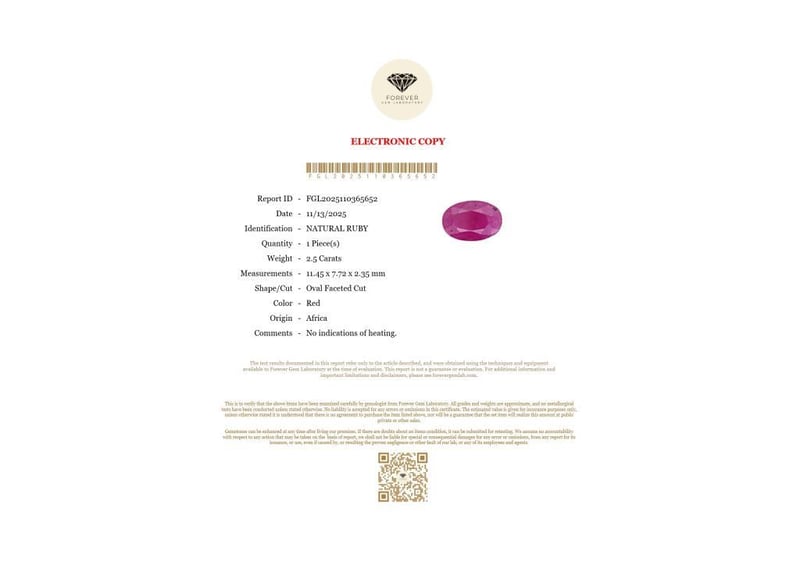 2.5 CARATS NATURAL RUBY 2.5 Carats Natural RubyCertificate Number - Fgl2025110365652Color - RedShape - Oval Faceted CutDimension - 11.45 X 7.72 X 2.35 MmOrigin - AfricaComments - No Indications Of Heating.Good Quality With Luster Condition: Good - Refer Images 0488434+41
