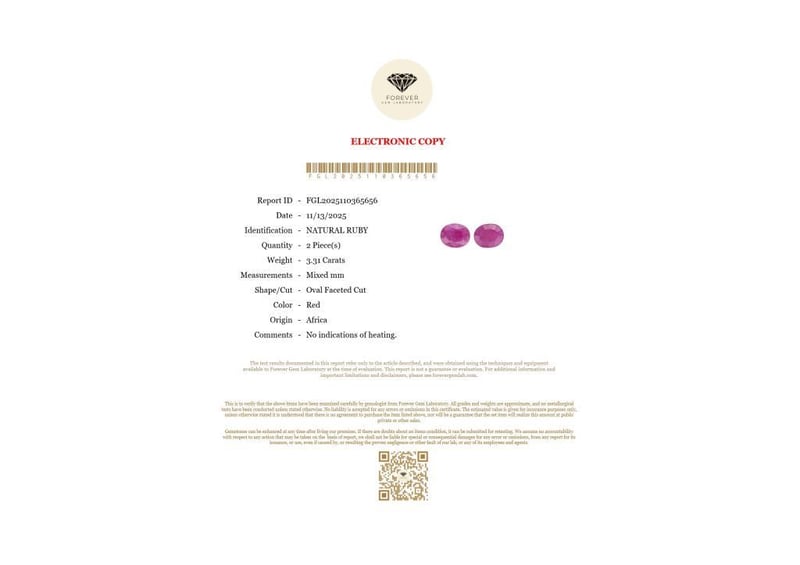 3.31 CARATS NATURAL RUBY 3.31 Carats Natural RubyCertificate Number - Fgl2025110365656Color - RedShape - Oval Faceted CutDimension - Mixed MmOrigin - AfricaComments - No Indications Of Heating.Good Quality With Luster Condition: Good - Refer Images 0488434+45