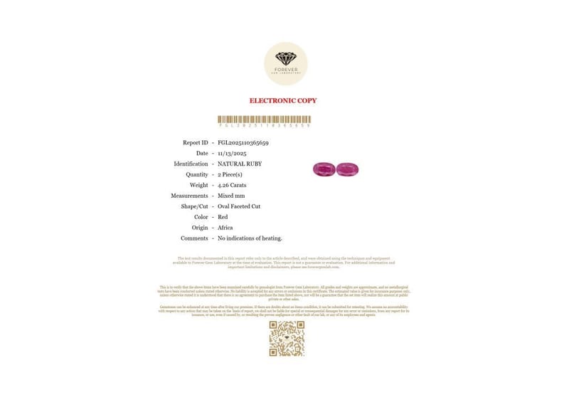 4.26 CARATS NATURAL RUBY 4.26 Carats Natural RubyCertificate Number - Fgl2025110365659Color - RedShape - Oval Faceted CutDimension - Mixed MmOrigin - AfricaComments - No Indications Of Heating.Good Quality With Luster Condition: Good - Refer Images 0488434+48