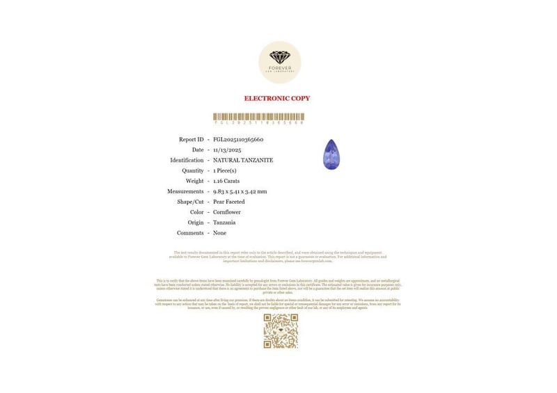 1.16 CARATS NATURAL TANZANITE 1.16 Carats Natural TanzaniteCertificate Number - Fgl2025110365660Color - CornflowerShape - Pear FacetedDimension - 9.83 X 5.41 X 3.42 MmOrigin - TanzaniaComments - NoneGood Quality With Luster Condition: Good - Refer Images 0488434+49
