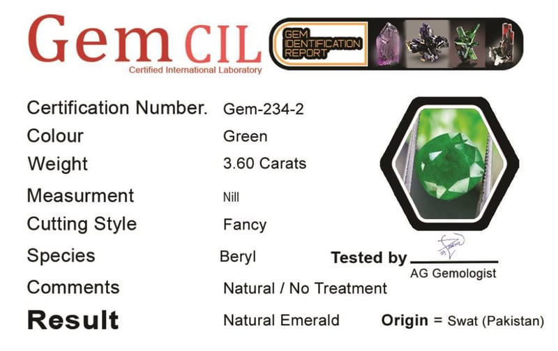 3.60 CARATS NATURAL VIVID GREEN EMERALD 3.60 Carats Natural Vivid Green EmeraldStone = Natural EmeraldWeight = 3.60 Carats Colour = Green Cut = Fancy Lustre = Excellent Treatment = No Oil (Natural)Transparency = Transparent Origin = Swat (Pakistan) Condition: Good - Refer Images 0488425+2