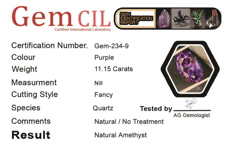 11.15 CARATS NATURAL QUALITY BRAZILIAN AMETHYST 11.15 Carats Natural Quality Brazilian AmethystStone = Natural AmethystWeight = 11.15 CaratsColour = PurpleCut = Fancy Lustre = Excellent Note = Gem Cil, Certified, Precise Custom Cut (Not Commercial) Condition: Good - Refer Images 0488425+9