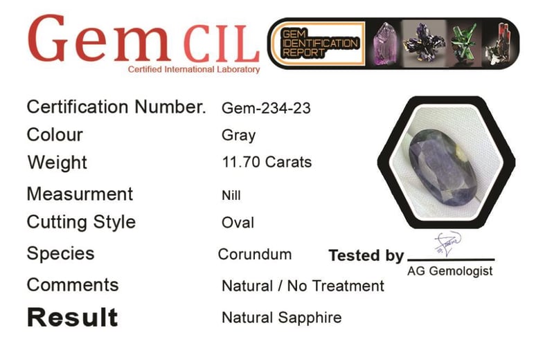 11.70 CARATS NATURAL CERTIFIED SAPPHIRE 11.70 Carats Natural Certified Sapphire Stone = Natural SapphireWeight = 11.70 Carats Cut = Oval Colour = Gray/ BlueLustre = ExcellentTreatment = Natural (No Treatment Detected) Note = Gem Cil, Certified, Precise Custom Cut (Not Commercial) Condition: Good - Refer Images 0488425+23