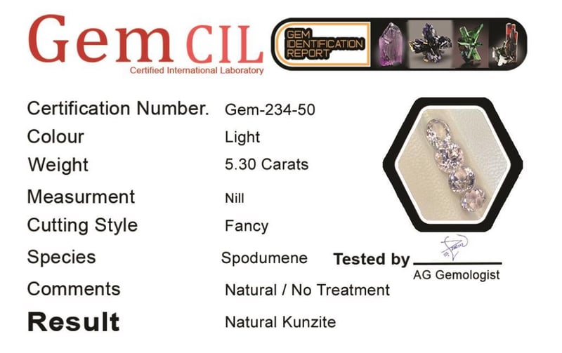 5.30 CARATS NATURAL KUNZITE 5.30 Carats Natural Kunzite Stone = Natural KunziteWeight = 5.30 Carats Colour = LightCut = Fancy Lustre = ExcellentNote = Gem Cil, Certified, Precise Custom Cut (Not Commercial) Condition: Good - Refer Images 0488425+50