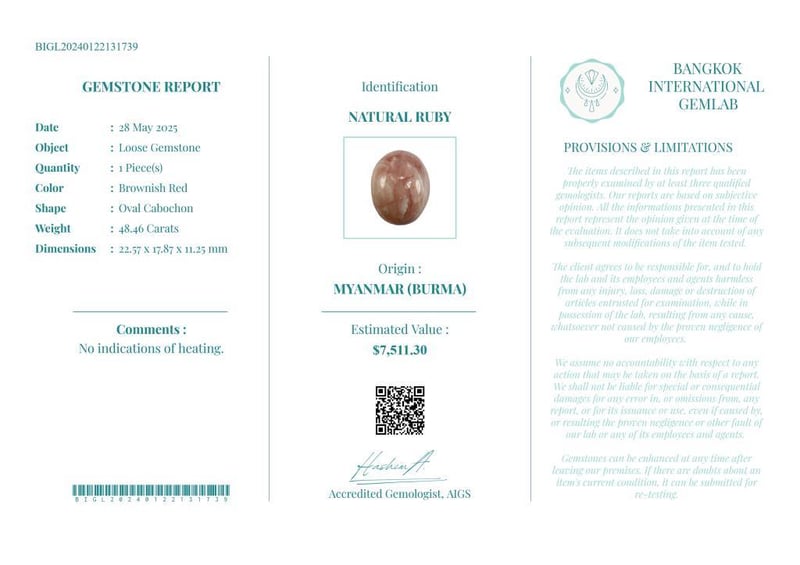 48.46 CARATS CERTIFIED NATURAL RUBY Gemstone : Natural RubyCertificate Number : Bigl20240122131739Weight : 48.46 CaratsColor : Brownish RedMeasurement : 22.57 X 17.87 X 11.25 MmShape : Oval CabochonQuantity : 1 PieceOrigin : Myanmar (Burma)Comments : No Indications Of Heating.• Use The Qr Code On The Packaging To View And Download The Certificate. • Verify Report Online At Www.Bangkokinternationalgemlab.Co Condition: Good - Refer Images 01611158+2