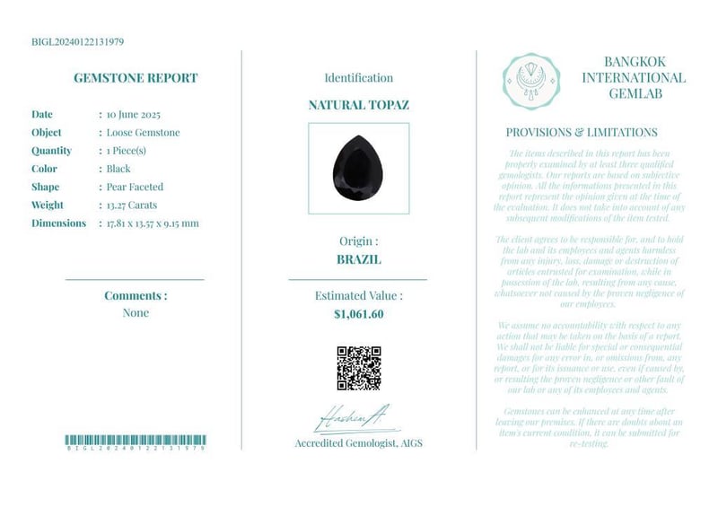 13.27 CARATS CERTIFIED NATURAL TOPAZ Gemstone : Natural TopazCertificate Number : Bigl20240122131979Weight : 13.27 CaratsColor : BlackMeasurement : 17.81 X 13.57 X 9.15 MmShape : Pear FacetedQuantity : 1 PieceOrigin : BrazilComments : None• Use The Qr Code On The Packaging To View And Download The Certificate. • Verify Report Online At Www.Bangkokinternationalgemlab.Co Condition: Good - Refer Images 01611158+18