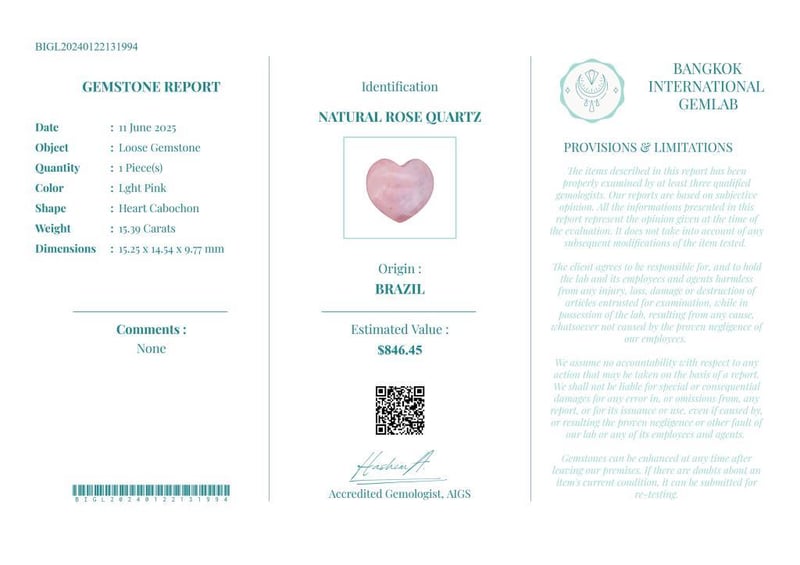 15.39 CARATS CERTIFIED NATURAL ROSE QUARTZ Gemstone : Natural Rose QuartzCertificate Number : Bigl20240122131994Weight : 15.39 CaratsColor : Lght PinkMeasurement : 15.25 X 14.54 X 9.77 MmShape : Heart CabochonQuantity : 1 PieceOrigin : BrazilComments : None• Use The Qr Code On The Packaging To View And Download The Certificate. • Verify Report Online At Www.Bangkokinternationalgemlab.Co Condition: Good - Refer Images 01611158+19
