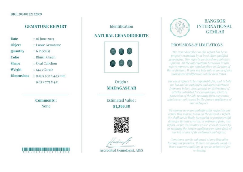 14.73 CARATS CERTIFIED NATURAL GRANDIDIERITE Gemstone : Natural GrandidieriteCertificate Number : Bigl20240122132069Weight : 14.73 CaratsColor : Bluish GreenMeasurement : 9.19 X 7.37 X 4.53 MmShape : Oval CabchonQuantity : 6 PieceOrigin : MadagascarComments : None• Use The Qr Code On The Packaging To View And Download The Certificate. • Verify Report Online At Www.Bangkokinternationalgemlab.Co Condition: Good - Refer Images 01611158+24