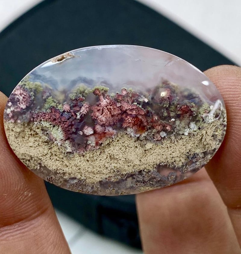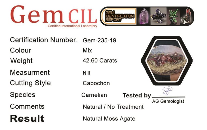 42.60 CARATS NATURAL MOSS AGATE 42.60 Carats Natural Moss AgateStone = Moss AgateWeight = 42.60 Carats Treatment = No Treatment (Natural)Cut = Cabochon Quantity = 1Note = Gem Cil, Certified, Condition: Good - Refer Images 0488426+19