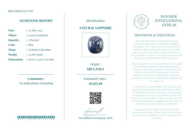 22.08 CARATS CERTIFIED NATURAL SAPPHIRE Gemstone : Natural SapphireCertificate Number : Bigl20240122131740Weight : 22.08 CaratsColor : BlueMeasurement : 16.79 X 14.79 X 7.61 MmShape : Cushion CabochonQuantity : 1 PieceOrigin : Sri LankaComments : No Indications Of Heating• Use The Qr Code On The Packaging To View And Download The Certificate. • Verify Report Online At Www.Bangkokinternationalgemlab.Co Condition: Good - Refer Images 01611159+2