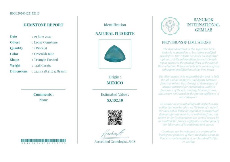 33.18 CARATS CERTIFIED NATURAL FLUORITE Gemstone : Natural FluoriteCertificate Number : Bigl20240122132115Weight : 33.18 CaratsColor : Greenish BlueMeasurement : 22.41 X 18.23 X 12.81 MmShape : Triangle FacetedQuantity : 1 PieceOrigin : MexicoComments : None• Use The Qr Code On The Packaging To View And Download The Certificate. • Verify Report Online At Www.Bangkokinternationalgemlab.Co Condition: Good - Refer Images 01611159+27
