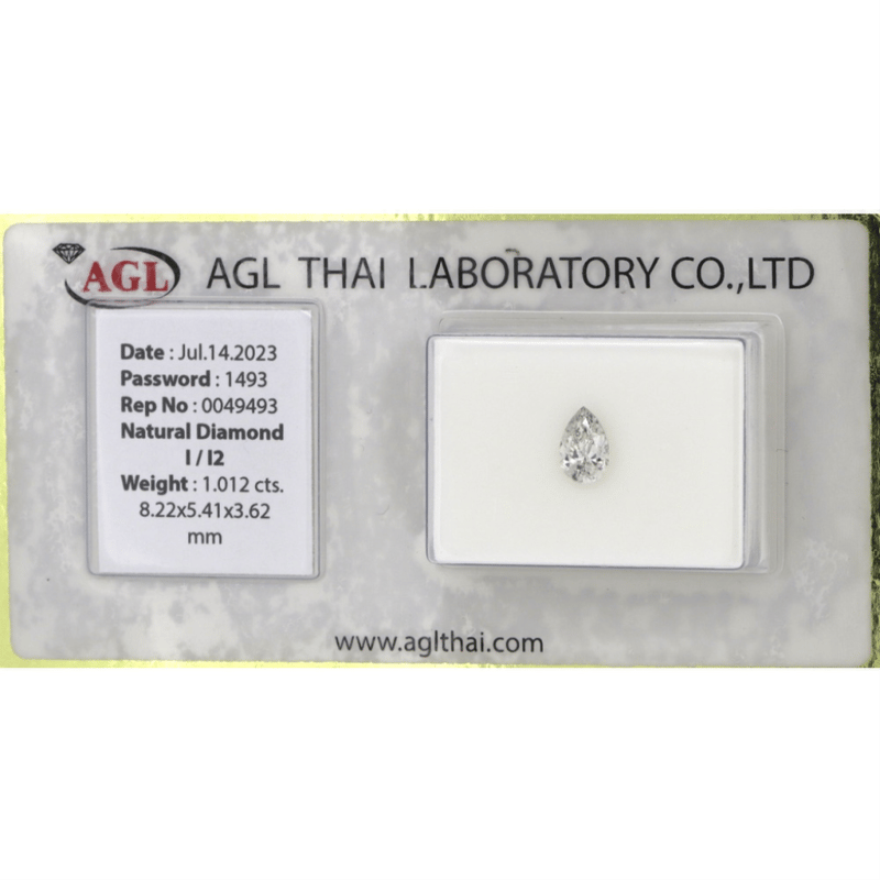 1.012CT CERTIFIED, NATURAL DIAMOND Pear Brilliant Cut, I Colour, I2 Clarity, Loose, Unset. Stone Comes Sealed With Agl Report: 0049493. Valuations Provided by an Independent Third-Party Professional Not Directly Associated With Lloyds Auctions at AUD $$10,500.00This valuation has been conducted by an independent third-party professional. The valuation amount is an assessment by the issuing valuer and does not reflect the auction value of the item. Any inquiries regarding the valuation should be directed to the issuing valuer (refer to contact details on the certificate), as Lloyds Auctions has no affiliation or influence over the valuation, the valuer, or the stated amount. Condition: Good - Refer Images 0645920+2103