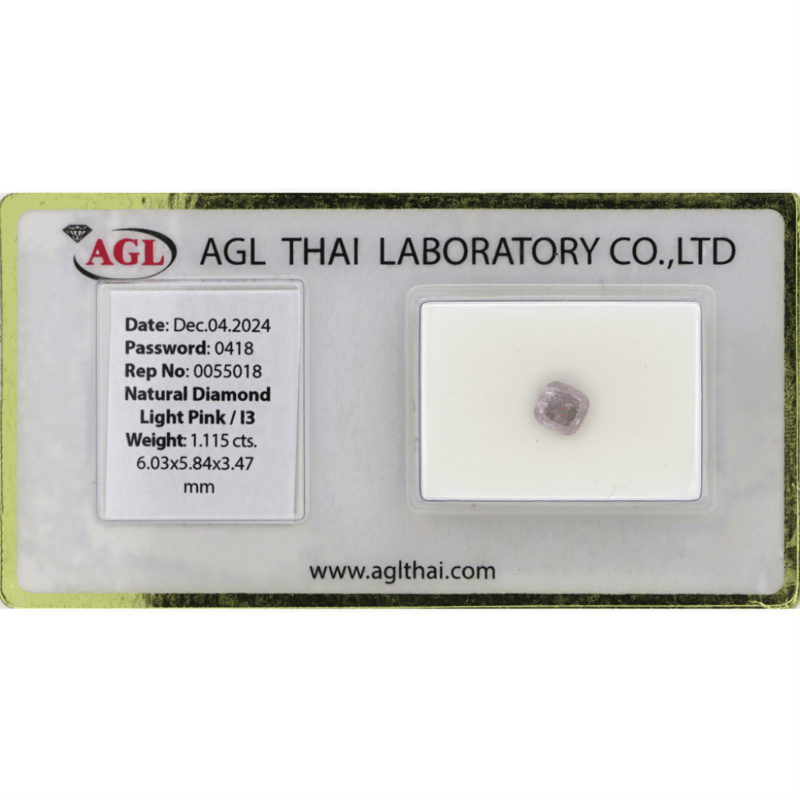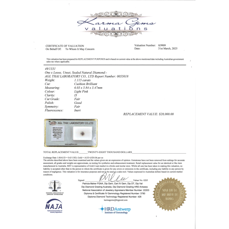 1.115CT CERTIFIED, NATURAL FANCY PINK DIAMOND Cushion Brilliant Cut, Light Pink Colour, I3 Clarity, Loose, Unset. Stone Comes Sealed With Agl Report:0055018. Valuations Provided by an Independent Third-Party Professional Not Directly Associated With Lloyds Auctions at AUD $$28,000.00This valuation has been conducted by an independent third-party professional. The valuation amount is an assessment by the issuing valuer and does not reflect the auction value of the item. Any inquiries regarding the valuation should be directed to the issuing valuer (refer to contact details on the certificate), as Lloyds Auctions has no affiliation or influence over the valuation, the valuer, or the stated amount. Condition: Good - Refer Images 0645920+2112