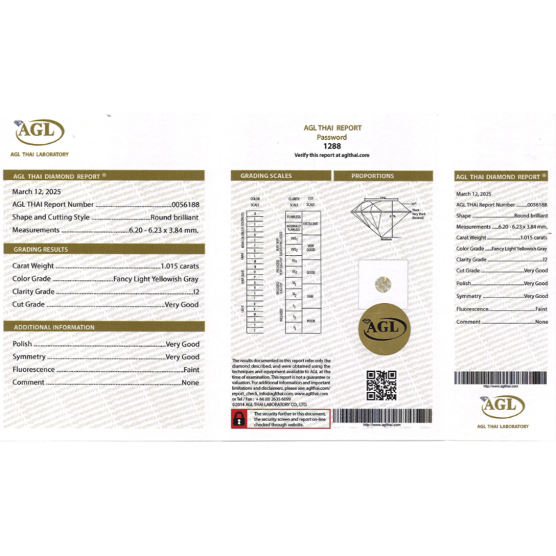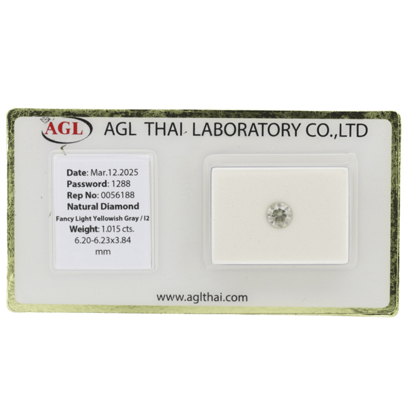 1.015CT CERTIFIED, NATURAL FANCY YELLOW DIAMOND Round Brilliant Cut, Light Fancy Yellowish-Grey Colour, I2 Clarity, Loose, Unset. Stone Comes Sealed With Agl Report: 0056188. Valuations Provided by an Independent Third-Party Professional Not Directly Associated With Lloyds Auctions at AUD $$9,000.00This valuation has been conducted by an independent third-party professional. The valuation amount is an assessment by the issuing valuer and does not reflect the auction value of the item. Any inquiries regarding the valuation should be directed to the issuing valuer (refer to contact details on the certificate), as Lloyds Auctions has no affiliation or influence over the valuation, the valuer, or the stated amount. Condition: Good - Refer Images 0645920+2116